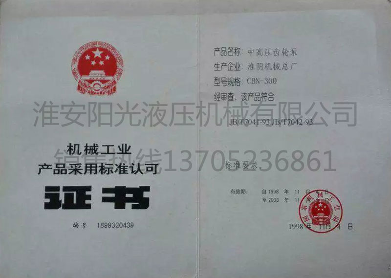 机械工业产品采用标准认可证书