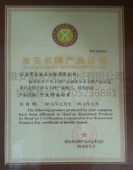 淮安名牌产品证书